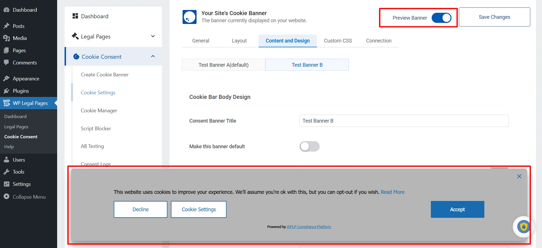 - To check how the banners will look to users, click the Preview Banner toggle button and switch between Test Banner A and Test Banner B.